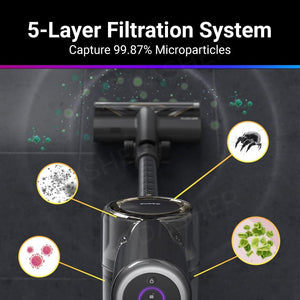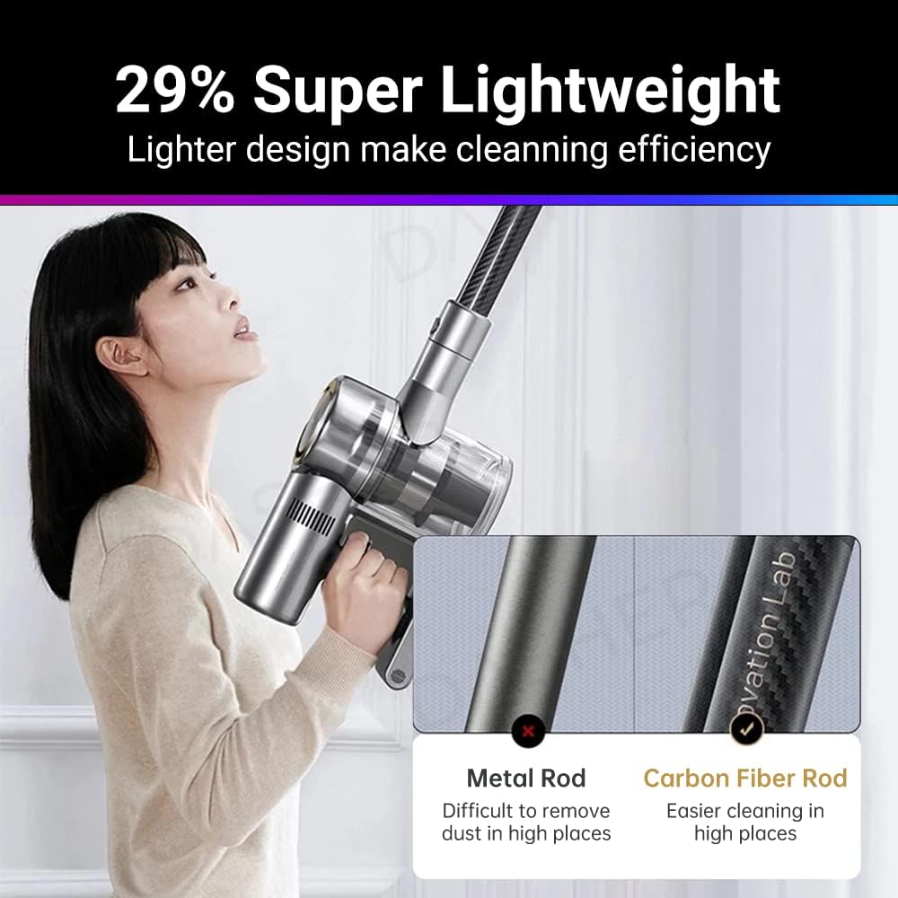 Battery life is a major strength of the V12, offering an incredible runtime of up to **90 minutes** on a single charge, powered by its high-capacity 3000mAh battery. The vacuum features a sophisticated **12-cone cyclone dust separation system** and five layers of filtration, ensuring that up to 99.9% of fine dust and allergens are captured, significantly improving air quality in your home.