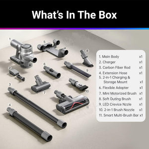 The **Dreame V12** is loaded with user-friendly features to make cleaning simple. The **Smart LED HD screen** provides you with real-time cleaning status and battery life, allowing you to plan your session effectively. For tackling tight spaces and furniture, the versatile included tools—like the flat nozzle with its handy **built-in LED light** and the high-efficiency **anti-mite brush**—guarantee that every surface in your home is left spotless and hygienic. Its lightweight 1.65 kg main body and one-click dust cup emptying finalize the V12 as the premium choice for efficient and powerful home care.