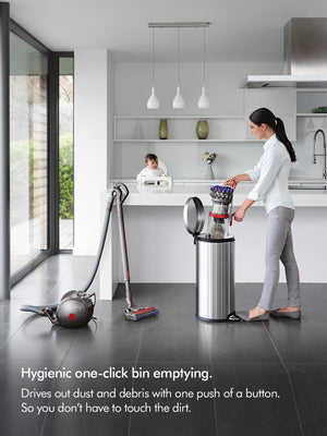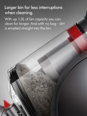 Hygienic Bin Emptying: Features a large 1.5-litre bin with an easy-to-use lever, allowing you to empty debris in one action without touching the dirt.