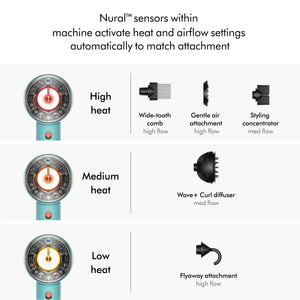 Dyson’s new Nural™ sensors activate Scalp protect mode, Attachment learning and Pause detect – all which help to make styling easier.