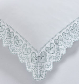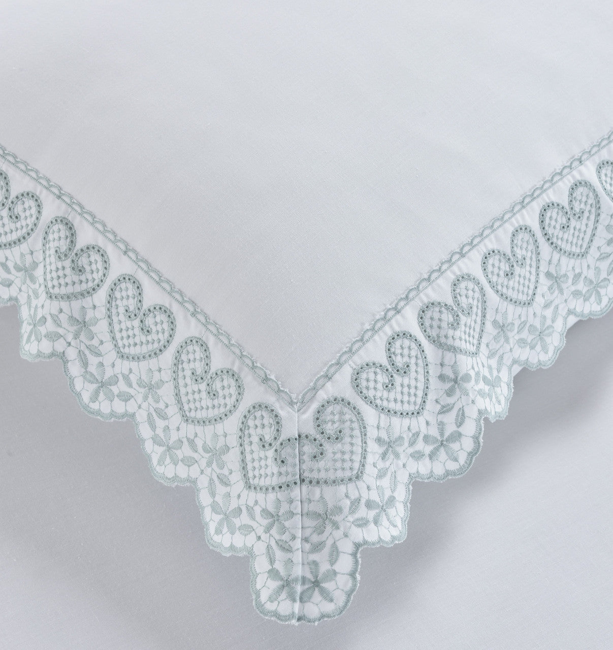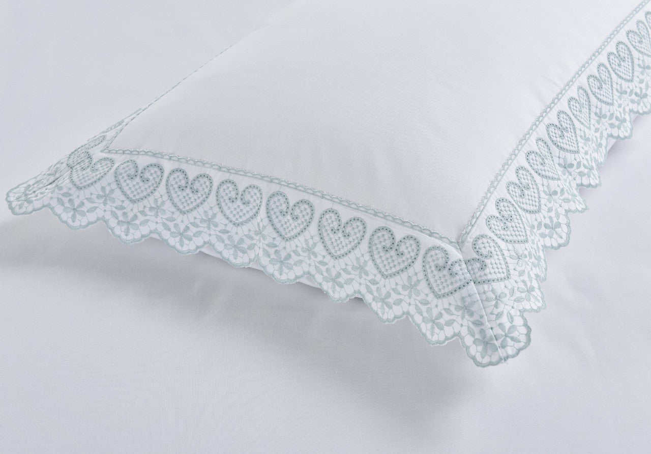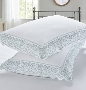 An elegant collection of beautifully crafted bed linen, our Elise design brings a touch of romance and sophistication to your bedroom. Featuring delicate heart-shaped embroidery and intricate lace edging on a soft, serene base, this bedding exudes timeless charm and luxury, perfect for creating a dreamy and inviting retreat.