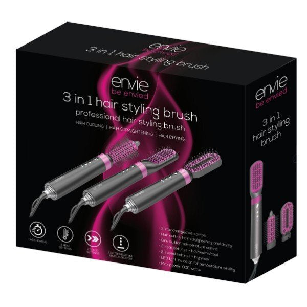 The envie detachable hair styling brush meets all your different styling needs. The hot air brush set contains a 12cm styling brush head for curling hair, a 14cm brush head for straightening hair and a 15cm brush for drying your hair.
