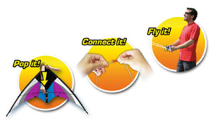 The kite pops into shape; just like an umbrella; then you simply slide the pre- fitted spars into place and attach the included flying lines