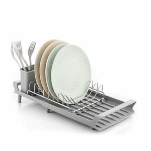 - Portable dish drainer: this modern dish drainer is ideal for drying dishes quickly and conveniently. It features a stainless steel rack with capacity for 8-9 plates placed vertically and a basket with two compartments for cutlery. The rack and basket are removable. The PP base is perfect for glasses and other kitchen utensils.