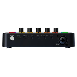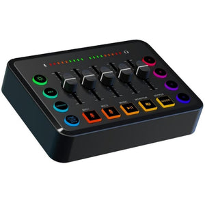 Enhance your live streaming experience with the F9 48V Live Streaming Sound Card Audio Mixer. This versatile device features a built-in voice changer and stunning RGB lighting, adding a professional touch to your audio setup. Perfect for podcasters, gamers, and content creators, this sound card offers a variety of sound effects and advanced audio processing capabilities to make your streams and recordings stand out. The sleek black design complements any setup, making it both functional and stylish.
