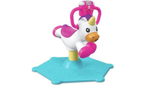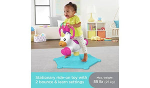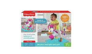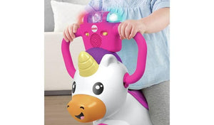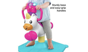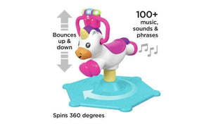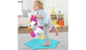 Get ready for magical learning fun with the Bounce and Spin Unicorn from Fisher-Price! Featuring a sturdy base, easy-grip handles, interactive buttons and multicolour lights, this stationary ride-on unicorn plays songs, whimsical sounds, and educational phrases as your baby bounces up and down or spins all around!