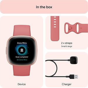 - Included in box: Fitbit Versa 4 Smartwatch (Size Small and Large Straps included). Wrist straps measure small 140 mm–180 mm with additional Large 180 mm–220 mm. Charger also included (compatible with other Fitbit Smartwatches)