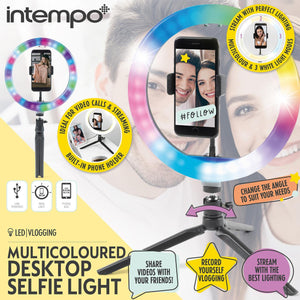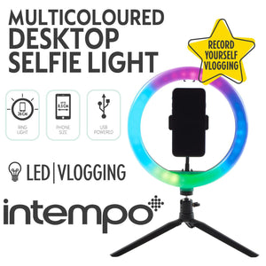 Perfect for recording vlogs and video calling, this Intempo Desktop Selfie Light is the ideal accessory and gift. Designed for effortless streaming, this free-standing device features a multi-coloured mode as well as three white light modes and a convenient phone holder for hands-free control. Simple to operate, this selfie light is powered via a USB connection and includes an easy-to-use controller. Boasting a 26 cm ring light and foldable feet, this desktop light is very user friendly.