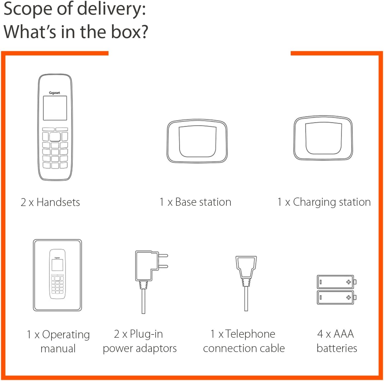 - SCOPE OF DELIVERY - 1 base station Gigaset A170, 2 handsets Gigaset A170H, 1 charging cradle, 2 Plug in power adaptor, 1 phone connection cable, 4 AAA rechargeable batteries (NiMH), 1 battery compartment cover, 1 user manual.