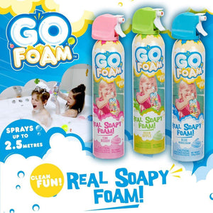 Get ready for instant foam fun with Go Foam! The all new way to clean whilst you play with super soapy foam that sprays up to 2.5 metres! Available in 3 scent-sational scents - Blue Bubblegum, Green Apple and Pink Berry playtime has never been so celan and smelt so good! Go Foam has an easy to use trigger nozzle making it easy for little hands to spray and control. Why not practise writing letters and numbers or drawing patterns in the bath?! With the no stain formula its mess free for the home and also safe for little eyes. Also suitable for outdoor use - why not use Go Foam for an outdoor backyard bubble party or to foam up a slip and slide?! Whether its bathtime or playtime Go Foam is good clean fun! One supplied