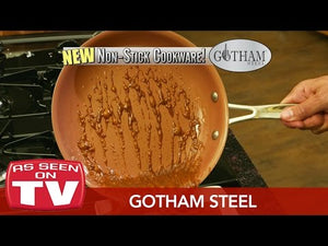 With a Triply reinforced stainless steel exterior & a Ti-Cerama interior, this is one of the most powerful frying pans form Gotham Steel! The fry pan has a high shine stainless steel chrome exterior that will elevate your kitchen. Non-stick, non-scratch (metal utensil safe), oven safe up to 500 degrees, flame-proof,. Induction compatible About the Product Gotham Steel is the first product of its class to actually utilize high-grade titanium and ceramic as surface finishing. This sophisticated combination not only ensures maximal durability it also allows for multi-fictional, all-around usage. Titanium plus Ceramic Coating FAQs High-heat threshold to sear perfectly browned steaks! Everything just slides right off, even burnt chocolate and cheese. Food flavor is not altered when cooking tomato-based or any acidic food products thanks to the ceramic component! The non-stick surface cleans easy! Versatile: for stove-top cooking, or baking! Rust-proof all over. Coating doesn't peel off with constant usage and washing. Our Guarantee Not satisfied with your purchase? Just tell us and we will fix things for you.