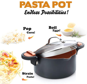 When it's time to strain, it can be such a pain. You splash and spill your pasta everywhere. Not anymore! introducing the Gotham Steel non stick pasta pot - the revolutionary pasta pot! Gotham Steel pasta pot is the revolutionary, 5-quart or 4 quart pasta pot complete with a lock-on lid that doubles as a smart strainer. The tempered glass lid has large holes on one side for draining larger foods like potatoes and ravioli, and small holes on the other for smaller foods like spaghetti and vegetables. Just lift and lock and you'll get a steady pour like never before! it's that easy! plus, with the Gotham Steel copper-infused, scratch-resistant surface, you can boil and mash potatoes in the same pot! even cheesy chili mac is no match for the Gotham Steel pasta pot's non-stick surface.
