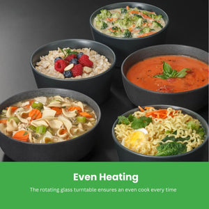 - Even heating – The rotating glass turntable ensures an even cook every time – Bon Appetit!