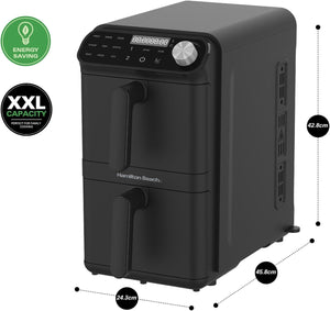 Hamilton Beach Air Fryer, 11L, Double Stack, 2460W, XXL, Space Saving Design, 9 Cooking Functions, Family Size, Non-Stick Dishwasher Safe Baskets, Black