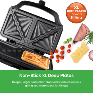 - Deep XL Plates – deeper, larger plates than standard sandwich makers giving you more space for fillings!
