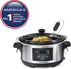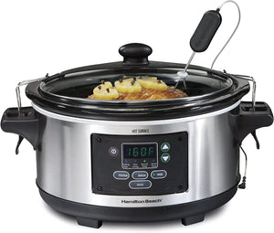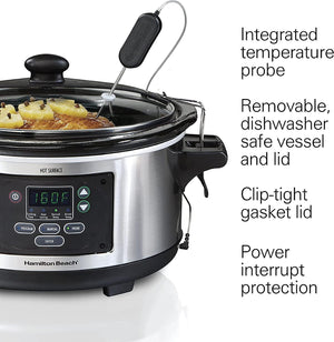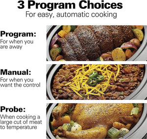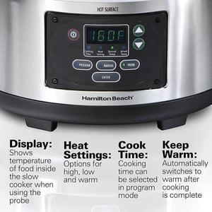 Eliminate weeknight stress with the Hamilton Beach Set & Forget Programmable Slow Cooker. With three choices for automatic cooking, having a family meal on a busy weeknight is easier than ever. What you make and how you prepare it are up to you. Three smart settings – probe, program and manual – allow you to cook foods to a specific temperature, for a set number of hours or on High, Low or Warm settings for up to 14 hrs.