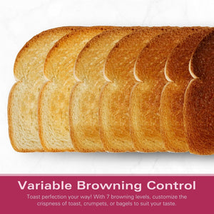 - 7 Adjustable Browning Levels: Achieve toast perfection every time. Choose from 7 browning levels to customise your toast, crumpets, or bagels to your preferred crispness and texture.