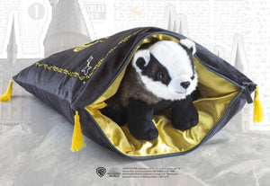 An embroidered velvet Hufflepuff house crest cushion, containing a removable plush of the Hufflepuff badger mascot as featured in the Harry Potter films.
