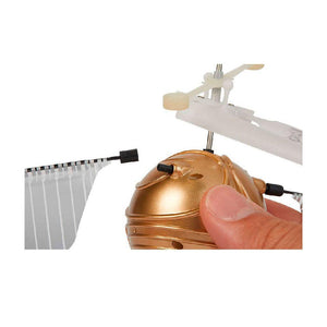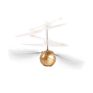 Enjoy making this Golden Snitch flying heliball fly. It is an exact replica of the original, with flapping wings and propellers that allow its flight and handling, causing the illusion that it is flying alone. It has various flight modes, such as random mode or directional flight pattern mode. It works with a built-in Li-Ion battery and the remote handset includes 1 x 3V CR2032 battery. It also includes instructions for use and spare wings, display stand and parchment with the rules of Quidditch.