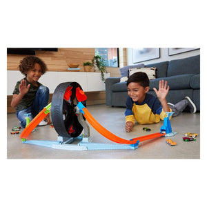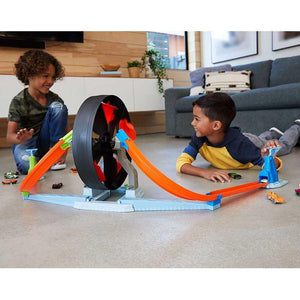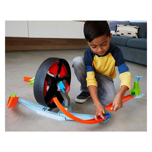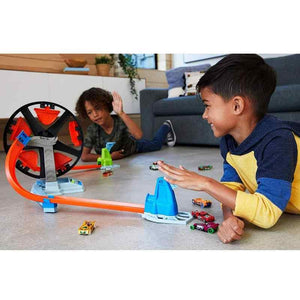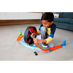 This exciting Hot Wheels play set includes everything kids need to test their high-performance driving skills. With the spinning wheel, two launchers and two cars included, kids can challenge themselves and each other to launch their cars down the track, through the spinning wheel and hit the scoring flaps on the wheel for points! Highest score total wins the day, but the challenge itself is where the fun is. Helps develop kids' motor skills, timing and competitive drive!