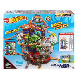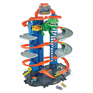 This Hot Wheels City set is the ULTIMATE challenge in the TALLEST Ultimate Garage playset so far, offering endless storytelling and vehicle action play! The enormous toy garage has parking for up to 100+ vehicles and a surprising Robo T-Rex nemesis that fuels kids’ imagination! Kids take their Hot Wheels toy cars all the way up in the kid-powered two-car elevator, then race down through the multi-level garage and experiment with multi-play mode for continuous thrills! Connects to other Hot Wheels sets (sold separately) and includes two Hot Wheels 1:64 scale vehicles, plus a feature for Hot Wheels ID action, too!