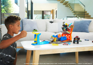 - The playset comes with 1 1:64 scale HW Demo Derby Monster Truck plus 3 crushable cars for immediate smashing and crashing right out of the box.