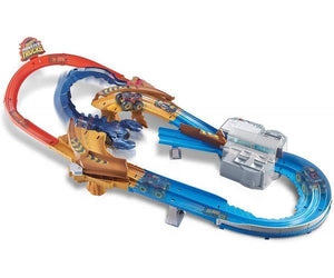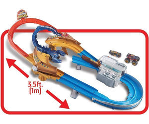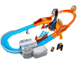 - This is the first time Hot Wheels® Monster Trucks and Hot Wheels® vehicles have teamed up to take down a creature nemesis in a track set built for both vehicles!