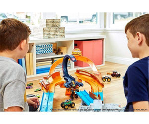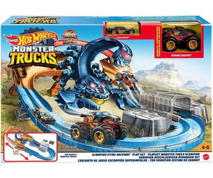 Hot Wheels® Monster Trucks delivers an over-the-top boosted set for Hot Wheels® cars and Hot Wheels® Monster Trucks with a striking new nemesis— a giant scorpion! Team your Monster Trucks with Hot Wheels® 1:64 scale vehicles to defeat the deadly scorpion nemesis in this thrilling large track set with an awesome banked turn and booster for multiple vehicle play. It won't be easy to avoid being snapped up in the scorpion's claws or his massive stinger, but teamwork can overcome challenges never met before! Set includes one exclusive Monster Truck with giant wheels and one 1:64 scale Hot Wheels® car.