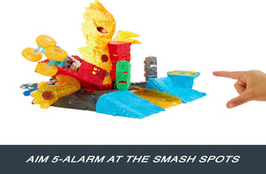 • Kids catapult or throw roll the included 1:64 scale Hot Wheels Monster Trucks 5-Alarm to hit the smash spots and demolish the building.