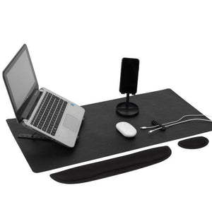 - Great for organising your space, this set is complete with a phone holder, laptop riser, desk mat, two wrist supports and a cable tidy.