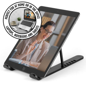- Compatible with most laptops, notebooks and tablets, this laptop stand is conveniently adjustable with eight different height levels.
