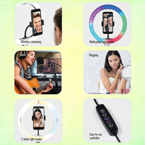 - The 26 cm ring light boasts three white light modes as well as a multicolour function so users can record with optimum lighting.