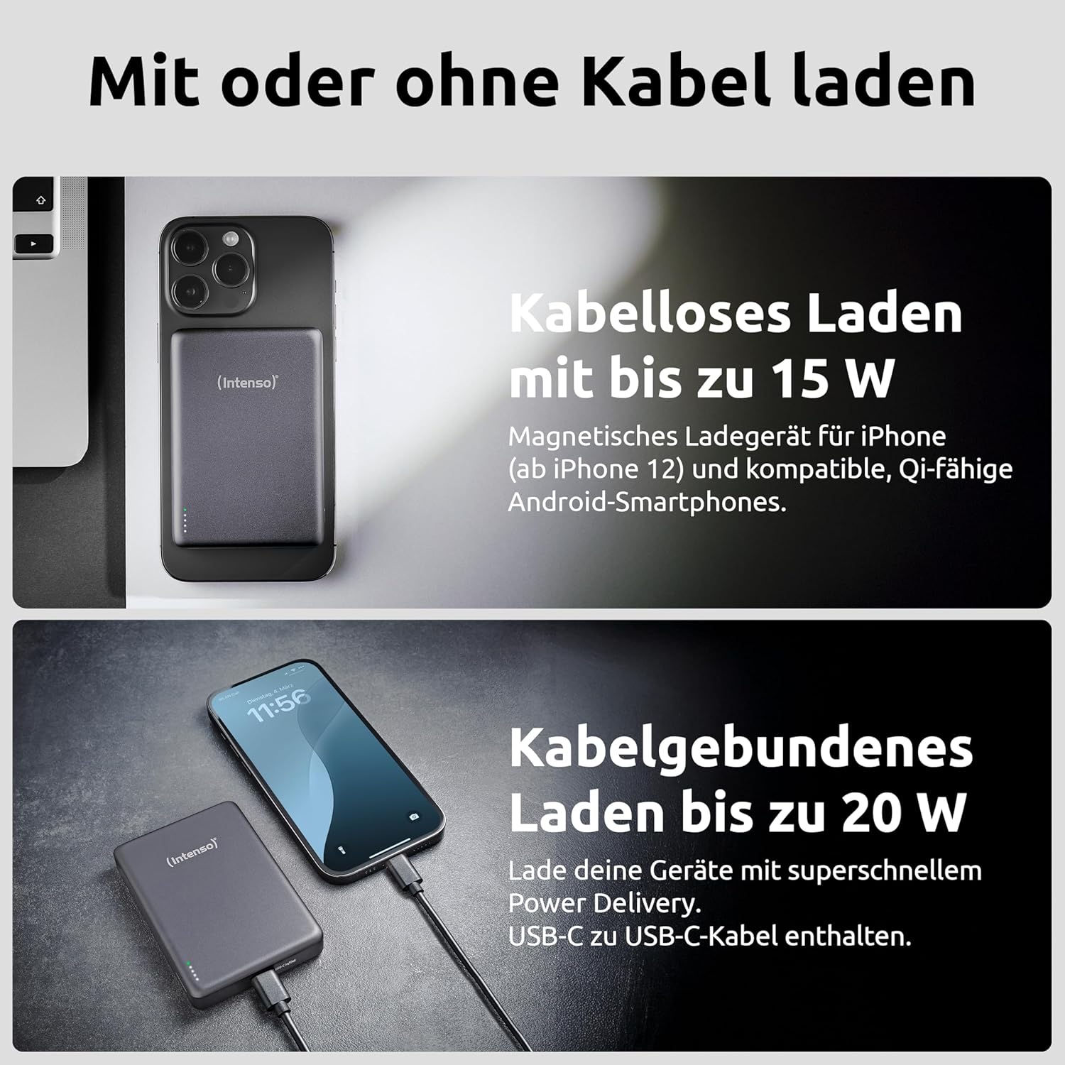 - Powerful & Fast: Wireless charging with up to 15 W, wired via USB-C Power Delivery with up to 20 W – ideal for on the go.