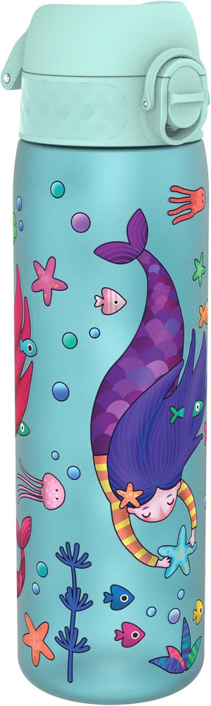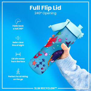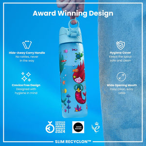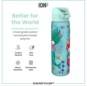 Ion8 Leak Proof Slim Water Bottle, Mermaids, 500ml (18oz), Easy to Open, Secure Lock, Dishwasher Safe, BPA Free, Hygienic Flip Cover, Carry Handle, Fits Cup Holders, Easy Clean, Carbon Neutral