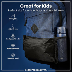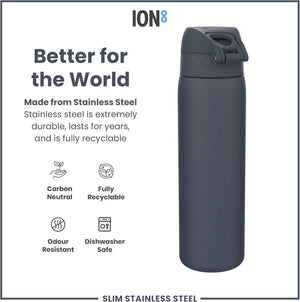Ion8 Leak Proof Slim Water Bottle, Stainless Steel, Ash Navy, 600ml (20oz), Non-Insulated, Leak Proof, Easy to Open, Secure Lock, Dishwasher Safe, Flip Cover, Fits Cup Holders, Carry Handle, Metal Water Bottle