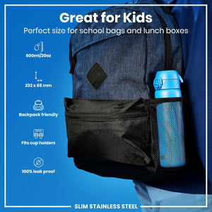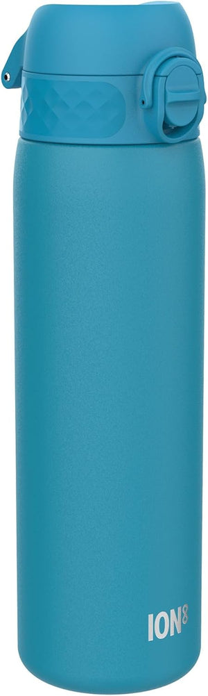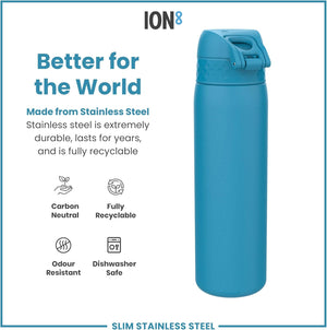 Ion8 Leak Proof Slim Water Bottle, Stainless Steel, Blue, 600ml (20oz), Non-Insulated, Leak Proof, Easy to Open, Secure Lock, Dishwasher Safe, Flip Cover, Fits Cup Holders, Carry Handle, Metal Water Bottle