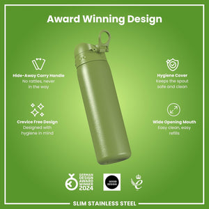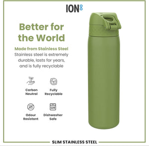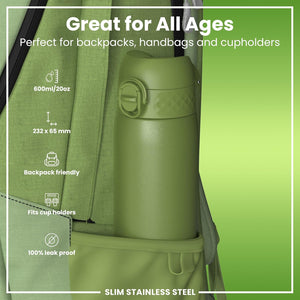Ion8 Leak Proof Slim Water Bottle, Stainless Steel, Khaki Green, 600ml (20oz), Non-Insulated, Leak Proof, Easy to Open, Secure Lock, Dishwasher Safe, Flip Cover, Fits Cup Holders, Carry Handle, Metal Water Bottle