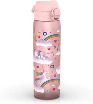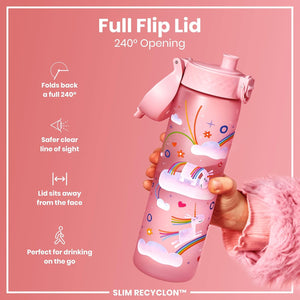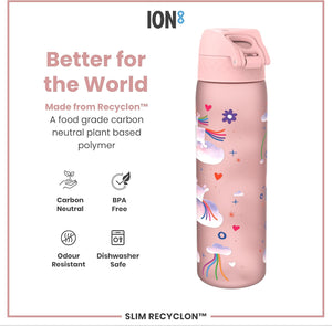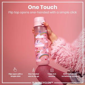 Ion8 Leak Proof Slim Water Bottle, Unicorn Rainbows, 500ml (18oz), Easy to Open, Secure Lock, Dishwasher Safe, BPA Free, Hygienic Flip Cover, Carry Handle, Fits Cup Holders, Easy Clean, Carbon Neutral