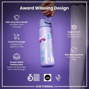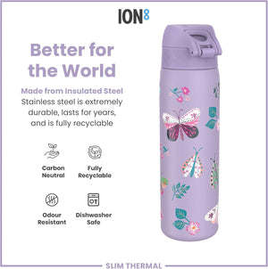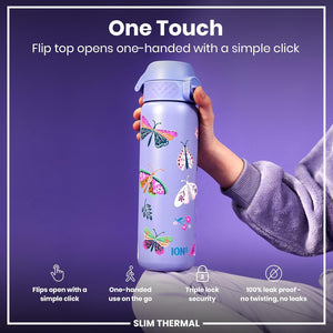 Ion8 Leak Proof Slim Water Bottle, Vacuum Insulated, Butterflys, 500ml (17oz), Leak Proof, Easy to Open, Secure Lock, Dishwasher Safe, Fits Cup Holders, Carry Handle, Scratch Resistant, Metal Water Bottle