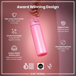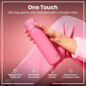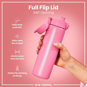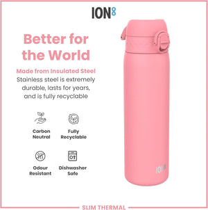 Ion8 Leak Proof Slim Water Bottle, Vacuum Insulated, Rose Bloom, 500ml (17oz), Leak Proof, Easy to Open, Secure Lock, Dishwasher Safe, Fits Cup Holders, Carry Handle, Scratch Resistant, Metal Water Bottle