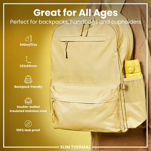 - PERFECTLY PORTABLE – As slim as a soda can, this leakproof bottle fits into cup holders and backpacks with ease. A smart thermos for kids or a slim thermal flask for active adults.