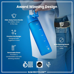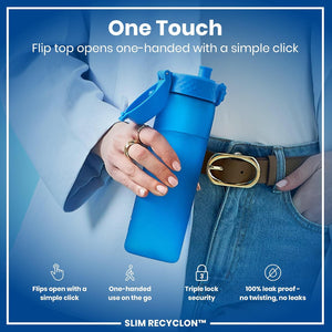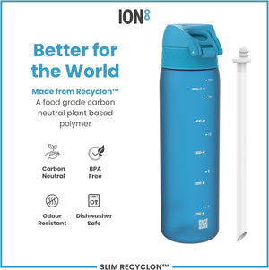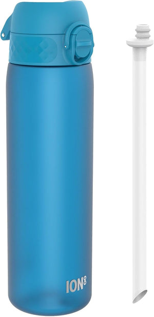 Ion8 Leak Proof Slim Water Bottle With Straw, Blue, 500ml (18oz), BPA-Free Drinking Bottle with Straw, Triple Lock Lid to Prevent Spills & Integrated Handle, Carbon Neutral, Recyclon