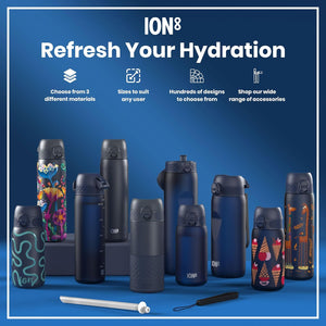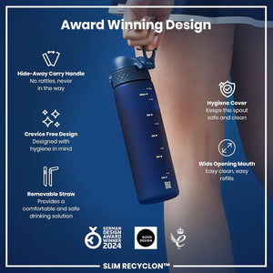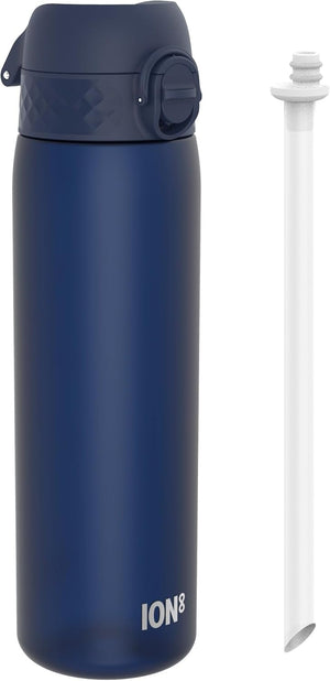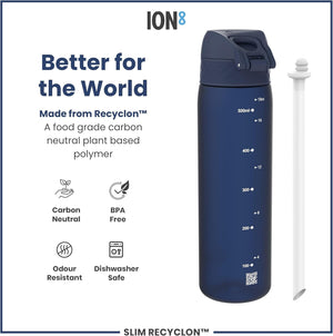 Ion8 Leak Proof Slim Water Bottle With Straw, Navy, 500ml (18oz), BPA-Free Drinking Bottle with Straw, Triple Lock Lid to Prevent Spills & Integrated Handle, Carbon Neutral, Recyclon