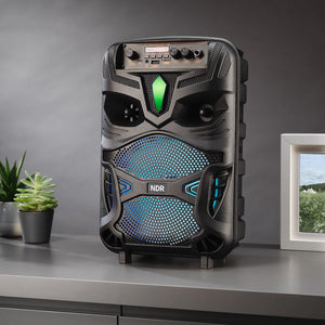 This speaker has 120W output at peak power. Simply stream your tunes to the speaker via Bluetooth 5.0 or plug in a USB stick or SD card. Then sing away with the included microphone and its echo effect. What about ambiance? The speaker is also equipped with an RGB colour lightshow, bringing colours to the room. And it even reacts to the music, making the karaoke bar vibe even stronger. With a rechargeable battery and carry handle, you can take this speaker wherever you want.