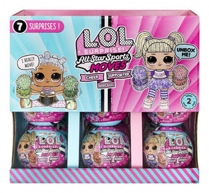 - 7 SURPRISES TO UNBOX: (1) L.O.L. Surprise! All Star Sports Moves- Cheer doll; (2) Fashion; (3) Shoes; (4) Bottle; (5) Accessory; (6) Move Feature; (7) Trading Card