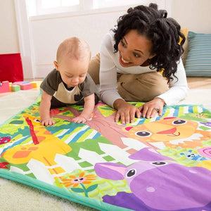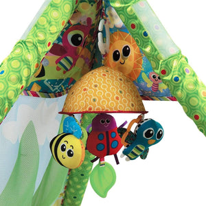 Four ways to play: lay & play, sit & explore, crawl tunnel & playtime teepee. enclosed teepee tent and 61”-wide large play mat. one mesh side panel provides clear view of baby - one of the mesh panels rolls up! 3 hanging toys with various features: crinkle, rattle, mirror, squeaker and teether.