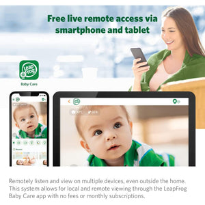 Watch over your little one at home on the 5-inch, 720p High-Definition LCD Parent Viewer Display or remotely on your smartphone/tablet with the LeapFrog Baby Care App.