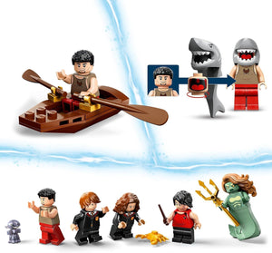 - 5 LEGO Harry Potter minifigures: Harry with flippers, Viktor Krum with a shark head, Hermione, Ron, a Merperson plus Grindylow and crab figures