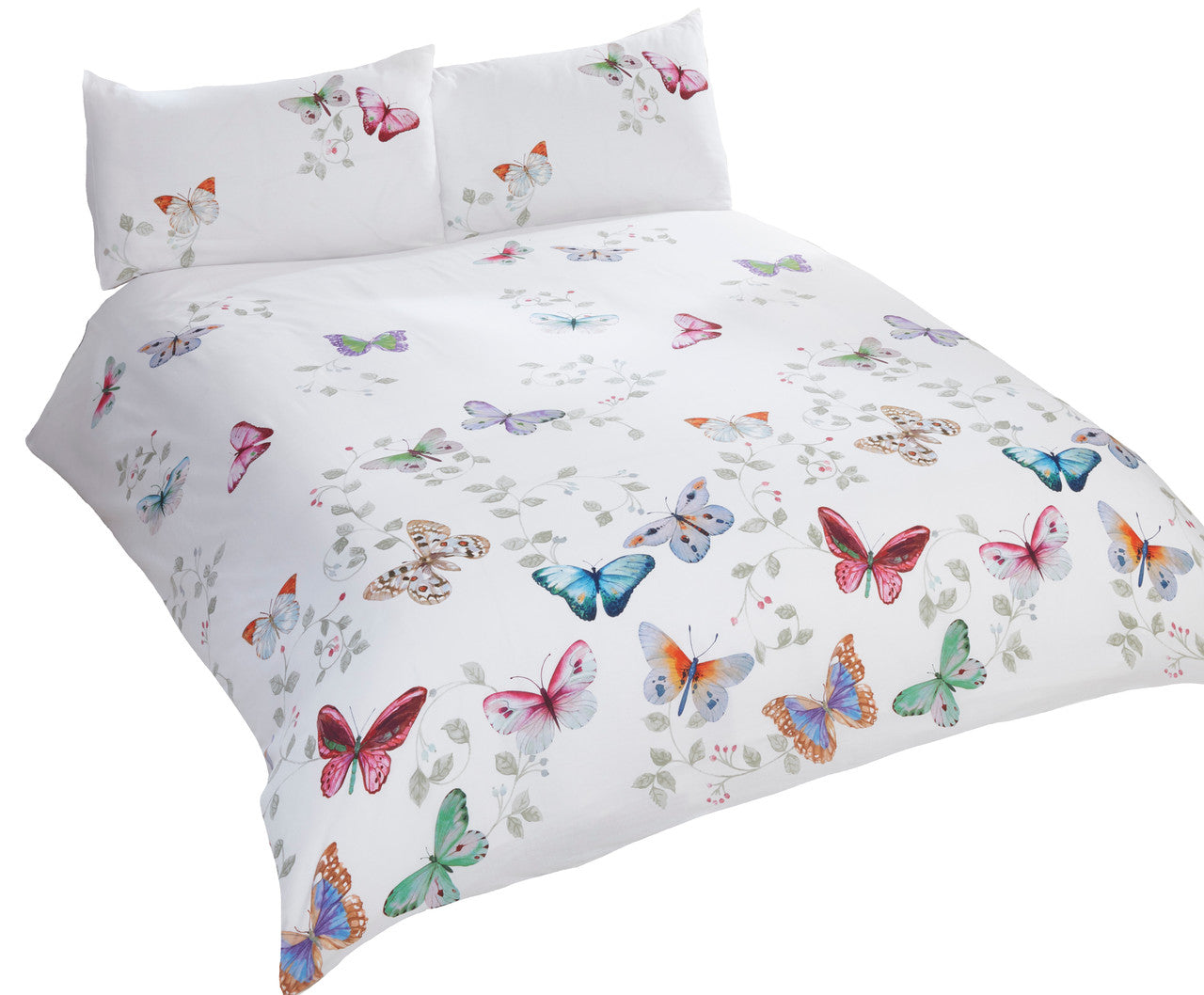 This stunning mariposa duvet set features a vintage watercolour painted style butterfly and trailing leaf design.