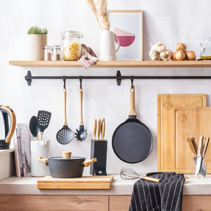 - ERGONOMIC HANDLES - Ergonomically designed handles for a balanced and comfortable grip. The wood effect look of the handles give a contemporary look in combination with the matte black knife blades.